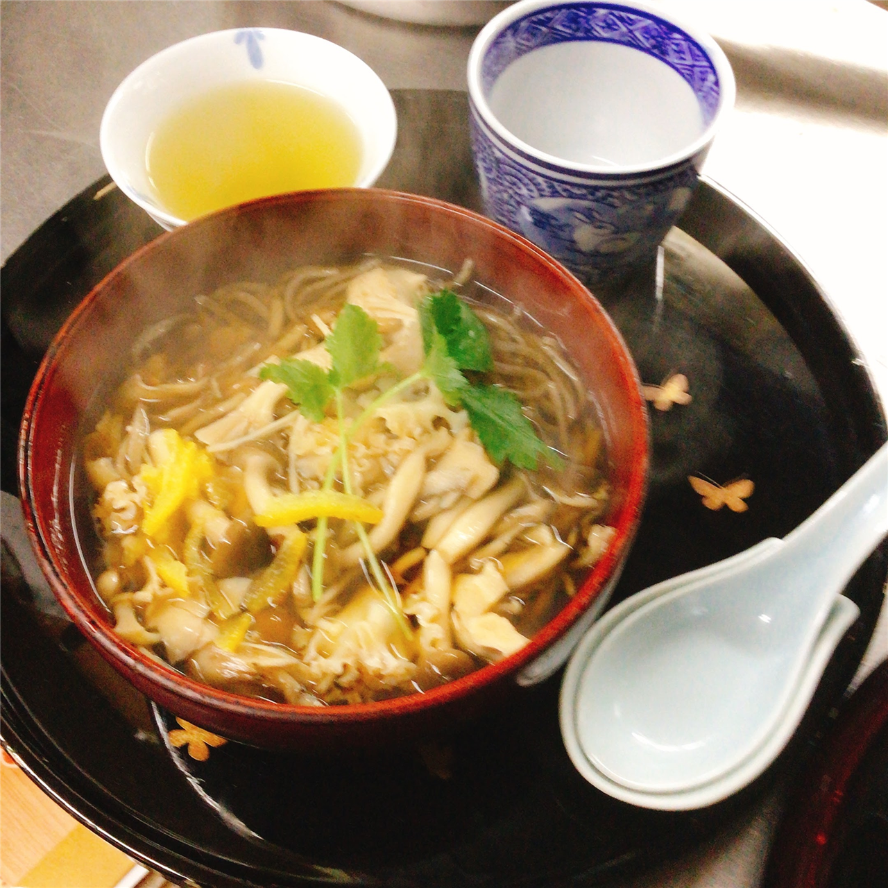 きのこそば たもぎたけ、えのき、しめじ、なめこ、はなびらたけ、舞茸
